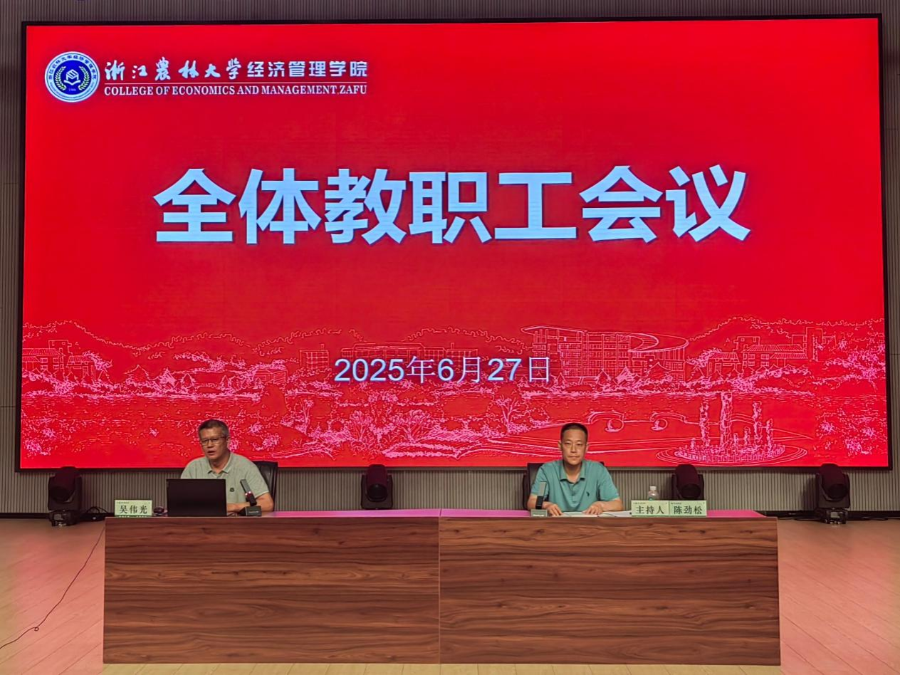 beat365官方网站召开全体教职工大会 6月27日下午,学院在衣锦校区报告厅召开全体教职工大会。学院全体教职工参加了会议,会议由党委书记陈劲松主持。院长吴伟光指出,2025年是“十四五”收官之年和“十五五”谋篇布局之年,学院要重点做好三方面工作:一是重视人才和团队建设,强化有组织科研,聚焦乡村振兴、数字经济等国家战略需求,打造高水平创新团队;二是夯实教学根基,加强基层教学组织建设,充分发挥课程组、教学团队在教学质量提升中的关键作用,全面提升...