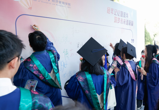 院研会精心布置了典礼现场,营造了浓厚的毕业氛围,特别设置了冷餐会,学院领导共切蛋糕,老师与学生在享受美食的同时相互惜别,共同享受这段美好时光。为了庆祝毕业生们顺利毕业,踏上逐梦新征程,场地上还摆放了留言板,老师和毕业生们都在上面留下了姓名以及对未来的寄语,给毕业生们留下了一段难忘的独家记忆。