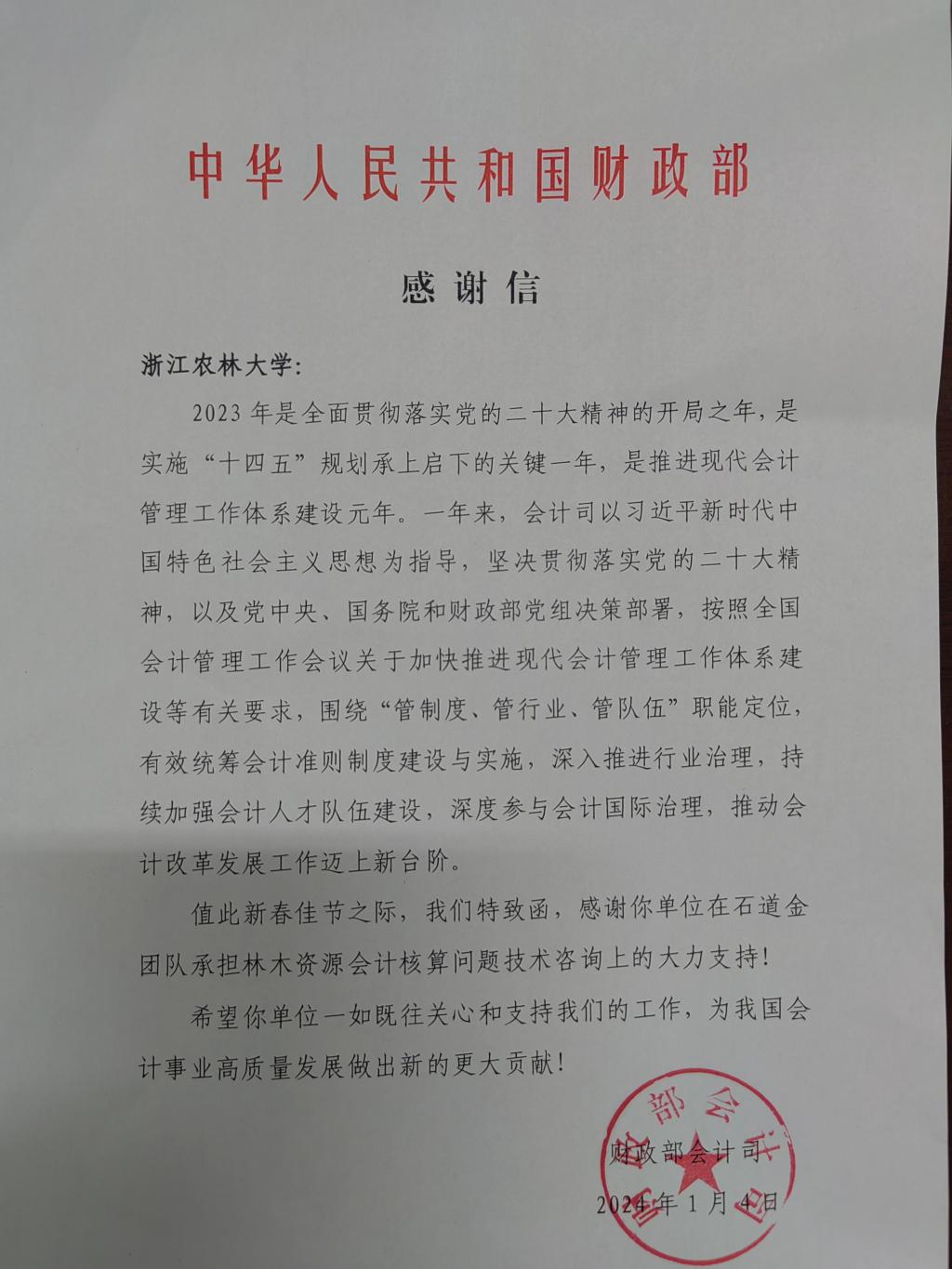日前,财政部会计司专门给我校发来感谢信。信中高度肯定了beat365官网石道金教授团队在财政部会计司工作中克难攻坚、勇挑重担,对推进现代会计管理工作体系建设过程中做出的辛勤付出表示了充分肯定。并对beat365官网围绕中心、服务大局,积极推动会计改革发展工作做出的突出贡献表达了诚挚谢意。
