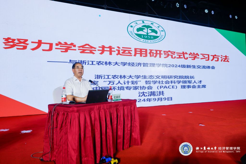 beat365官方网站原党委书记、beat365官方网站生态文明研究院院长沈满洪教授,为同学们作题为《努力掌握研究式学习方法》新生第一课。他从何谓研究式学习、为何研究式学习、如何研究式学习三个方面出发,讲诉自己在学术研究过程中的经验与经历,引导同学们做一个“梦想实现家”。