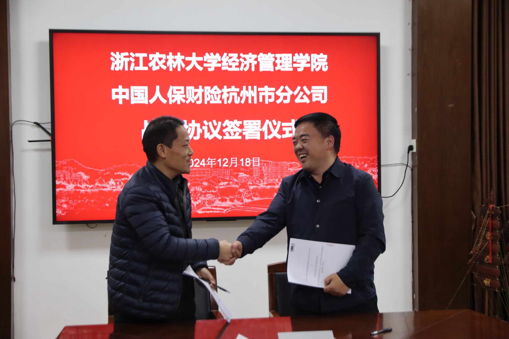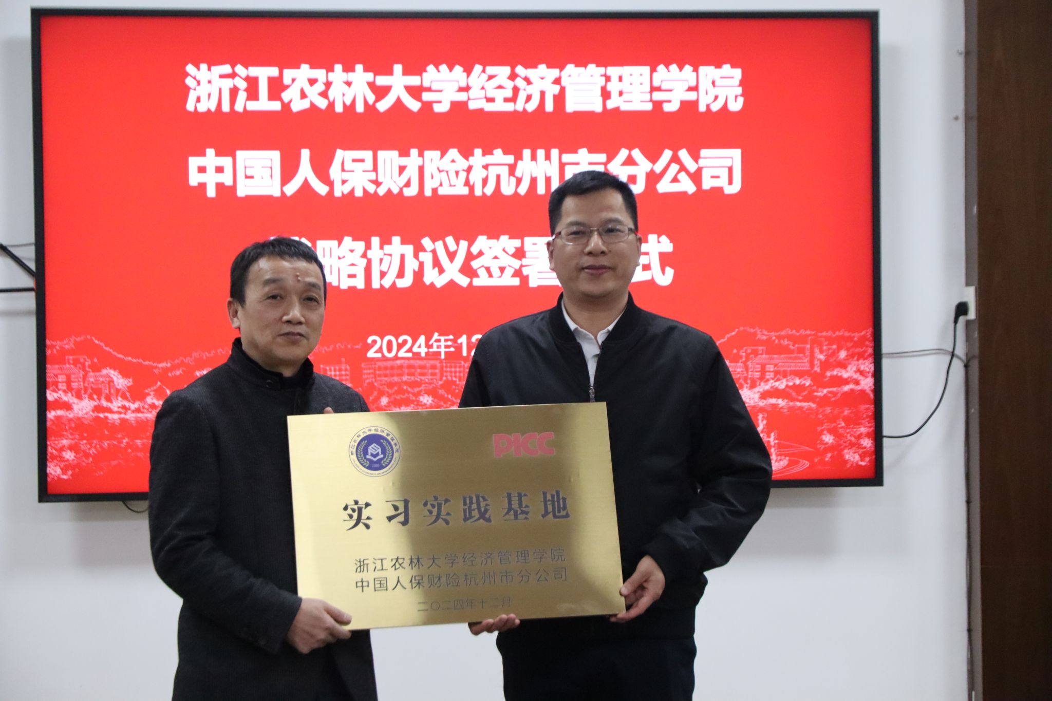 12月18日下午,beat365官方网站与中国人保财险杭州市分公司战略合作协议签约暨实习实践基地授牌仪式在西大楼208会议室举行。中国人保财险杭州市分公司副总经理詹春林、beat365官方网站党委书记陈劲松,双方团委、学科专业、行政人事及学生办等相关人员,参加了仪式。