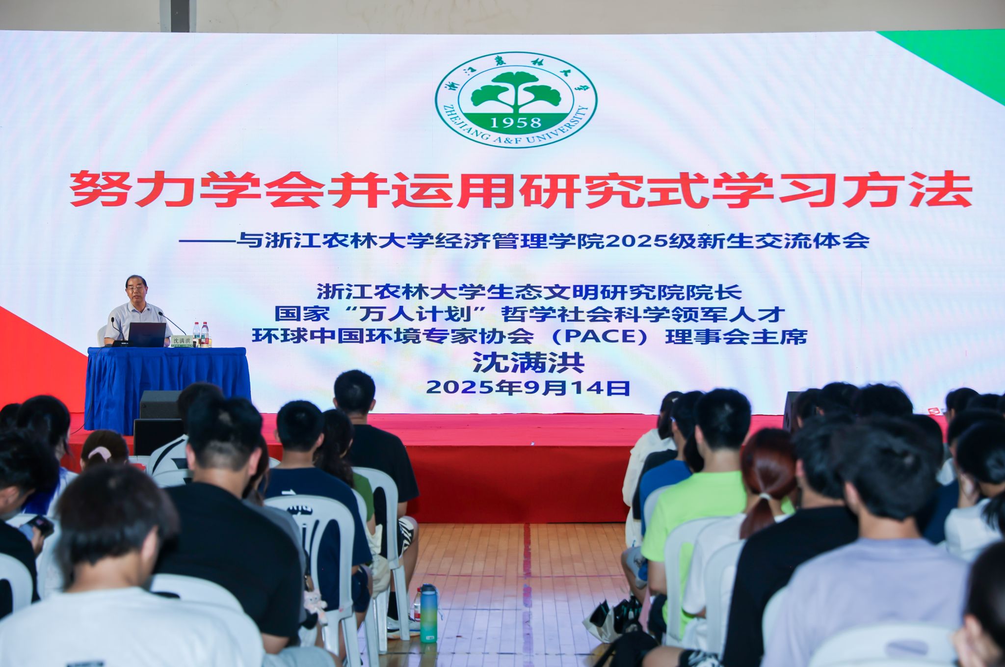 beat365官方网站原党委书记、beat365官方网站生态文明研究院院长沈满洪教授,为同学们作题为《努力掌握研究式学习方法》新生第一课。他从何谓研究式学习、为何研究式学习、如何研究式学习、三个方面出发,讲诉自己在学术研究过程中的经验与经历,引导同学们做一个“梦想实现家”。