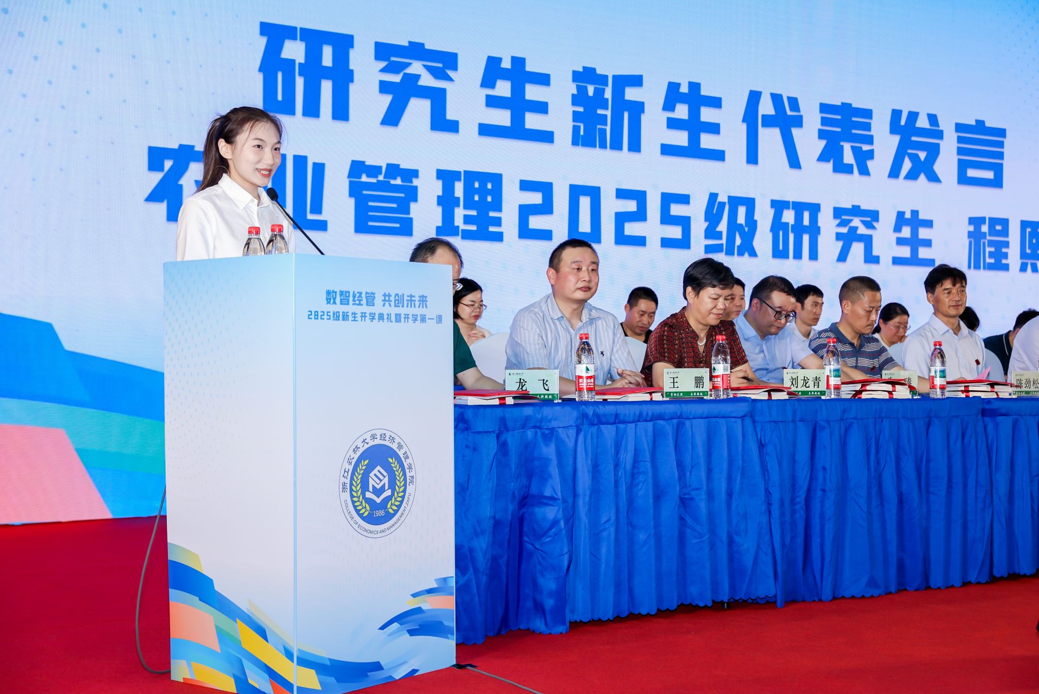 会计学252班郑云曦作为本科生代表,于陌上花开之际,致谢过往,鼓舞同学们共践理想;农业管理2025级研究生程熙则代表研究生新生,承诺继续以坚韧和热忱之心,走好学术与人生的长路;农林经济管理2024级博士生陆梦婷作为在校生代表,分享了自己的求学心得,鼓励学弟学妹们勇于探索,深耕学术科研领域。