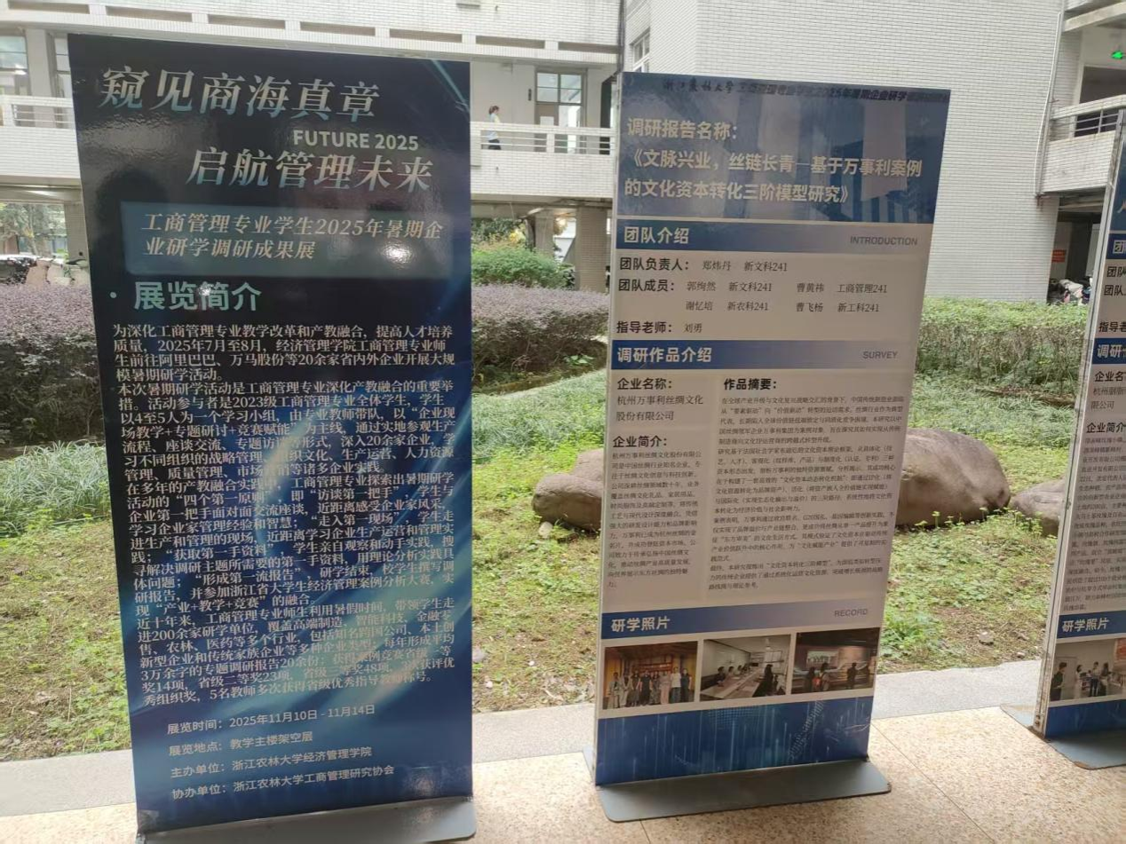 近日,由beat365官方网站beat365官方网站主办、工商管理研究协会协办的“窥见商海真章·启航管理未来”暑期企业调研成果展在衣锦校区成功展出。本次展览集中展示了2023级工商管理专业学生在2025年暑期赴阿里巴巴、万马股份等20余家知名企业开展研学活动的调研成果,吸引了大量师生驻足参观。