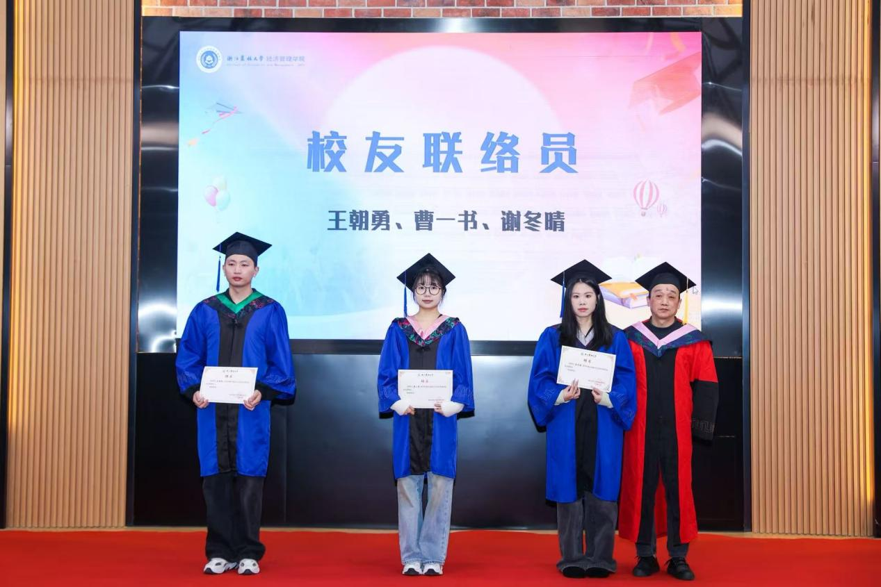 副院长蔡细平为校友联络员颁发了聘书,副院长朱臻为优秀研究生学位论文获得者颁发了荣誉证书。
