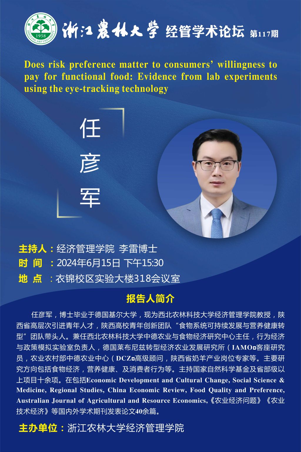 经管学术论坛第117期|Does risk preference matter to consumers' willingness to pay for functional food: Evidence from lab experiments using the eye-tracking technology