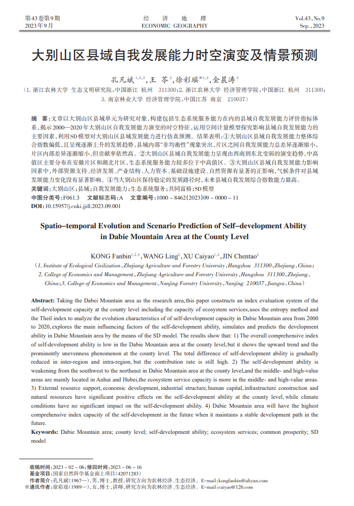 由beat365官网孔凡斌教授团队完成的学术论文《大别山区县域自我发展能力时空演变及情景预测》在浙大一级期刊《经济地理》2023年第9期正式发表。