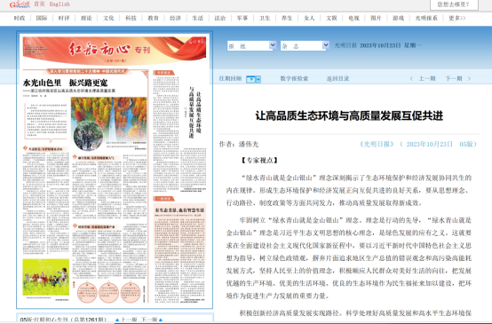 《光明日报》10月23日第5版《红船初心》专刊发表了《水光山色里 振兴路更宽——浙江杭州临安区以高品质生态环境支撑高质量发展》文章,潘伟光教授应邀以专家视角发表了 “让高品质生态环境与高质量发展互促共进”文章。