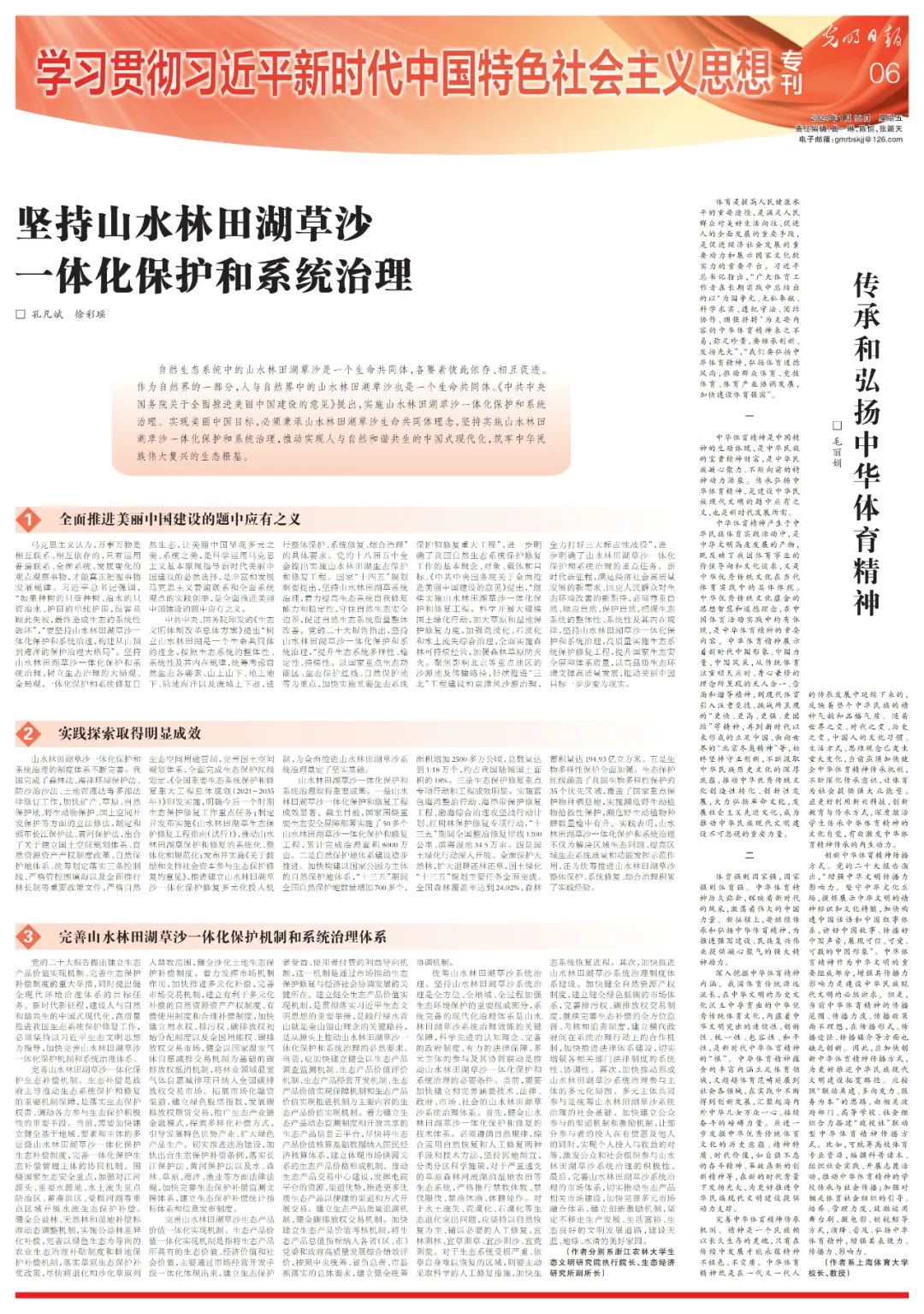 2024年1月19日,由孔凡斌教授和徐彩瑶副教授合作撰写的《坚持山水林田湖草沙一体化保护和系统治理》理论文章在《光明日报》理论部主办的学习贯彻习近平新时代中国特色社会主义思想专刊发表。该文是孔凡斌教授主持的2023年国家社会科学基金重大项目《山水林田湖草沙一体化保护和系统治理研究》(项目编号:23ZDA105)的阶段性研究成果。