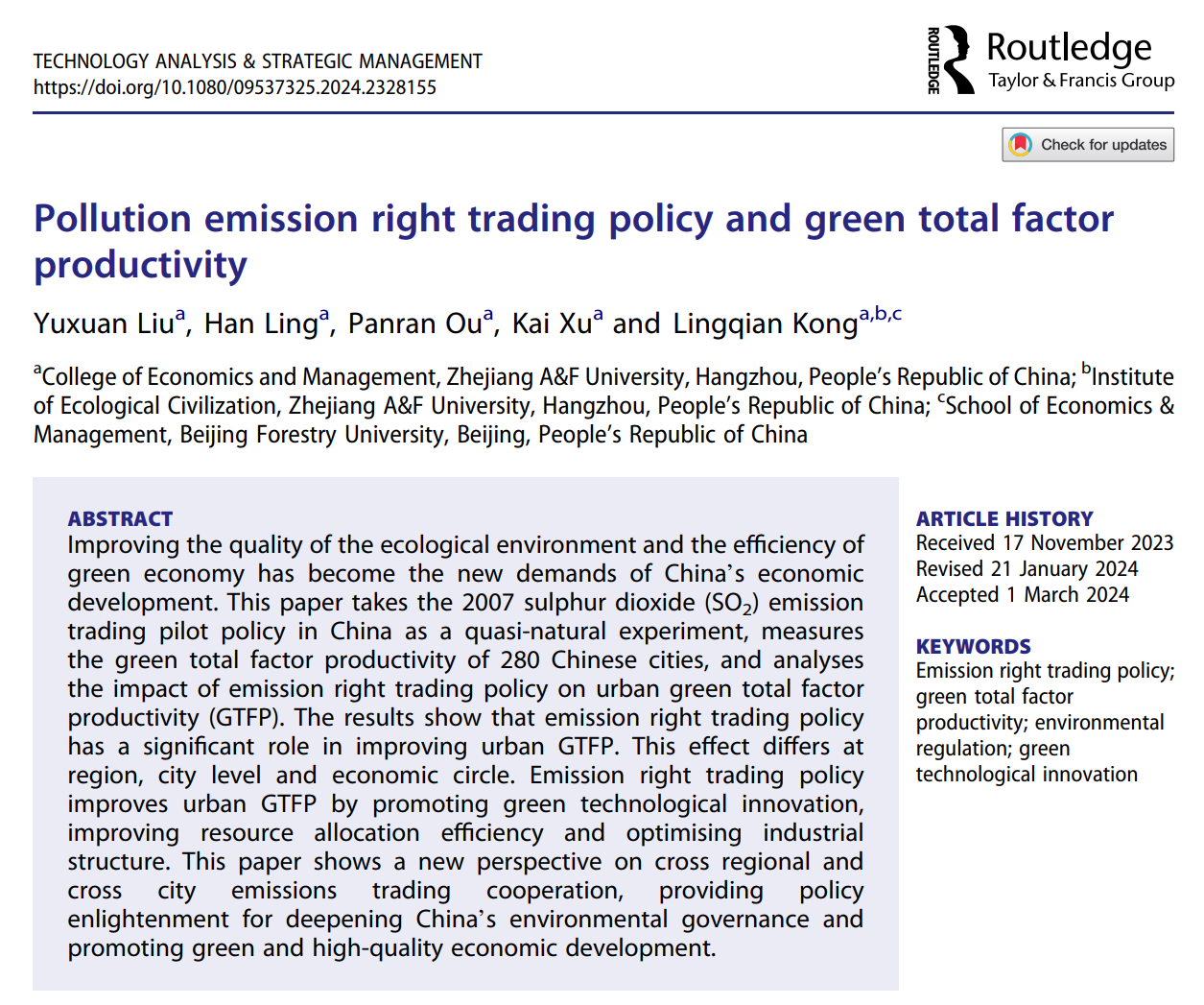 近日,由beat365官方网站2020级国贸专业本科生刘雨璇、凌涵和欧盼苒共同撰写的学术论文《Pollution emission right trading policy and green total factor productivity》在《Technology Analysis & Strategic Management》上发表,该期刊为SSCI收录期刊、ABS2星,论文通讯作者为国贸系孔令乾老师。该论文是孔令乾老师指导的浙江省大学生科技创新活动计划(新苗人才计划)“排污权交易机制对企业绿色全要素生产率的影响机理与对策研究”的阶段性成果,同时也是沈满洪教授主持的教育部哲学社会科学研究重大专项项目“习近平生态文明思想在中国大地的生动实践研究”和国家社科基金教育学一般项目“中国式现代化背景下大学生生态文明教育研究”的阶段性成果。此外,国贸系蒋琴儿教授、钱志权教授、熊立春副教授、刘琼博士以及管工学科徐凯博士亦参与指导并提供修改建议。