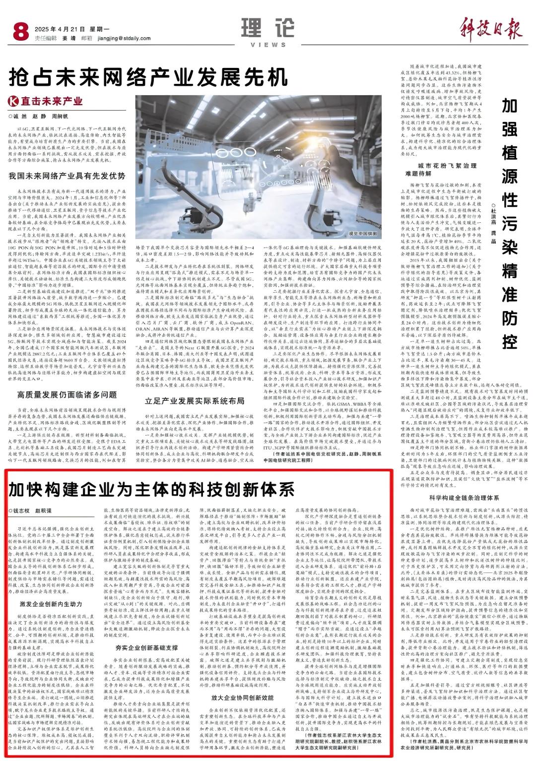 2025年4月21日,钱志权教授、赵积强老师于《科技日报》发表文章《加快构建企业为主体的科技创新体系》。现将全文转载如下: