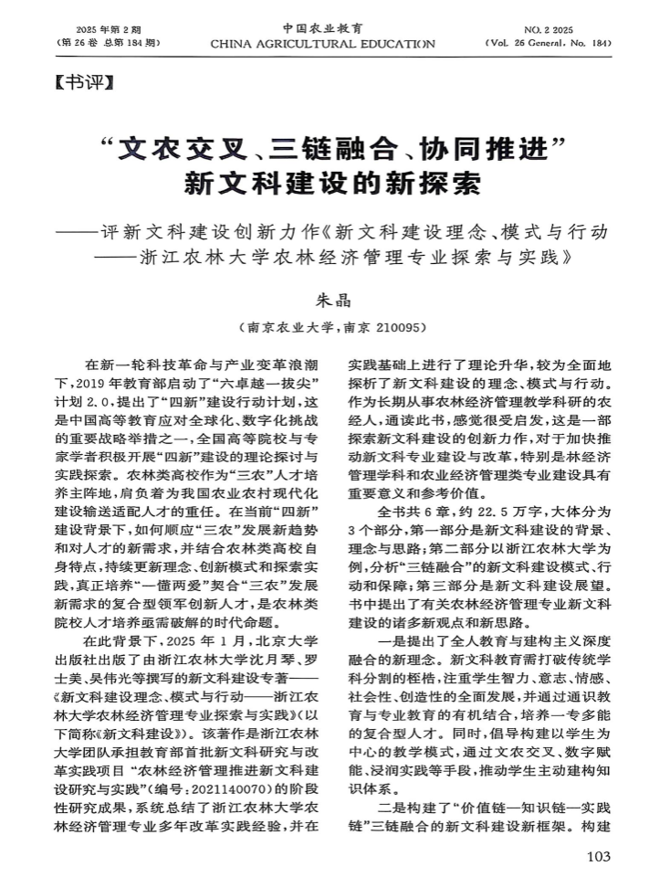 由beat365官网沈月琴、吴伟光、罗士美等撰写的新文科建设专著——《新文科建设理念、模式与行动——beat365官方网站农林经济管理专业探索与实践》在北京大学出版社出版后,在学界产生广泛影响。近日,由教育部长江学者特聘教授、国务院学科评议组农林经济管理学科召集人、南京农业大学朱晶教授撰写的书评《“文农交叉、三链融合、协同推进” 新文科建设的新探索——评新文科建设创新力作〈新文科建设理念、模式与行动——beat365官方网站农林经济管理专业探索与实践〉》在《中国农业教育》2025年第2期发表。