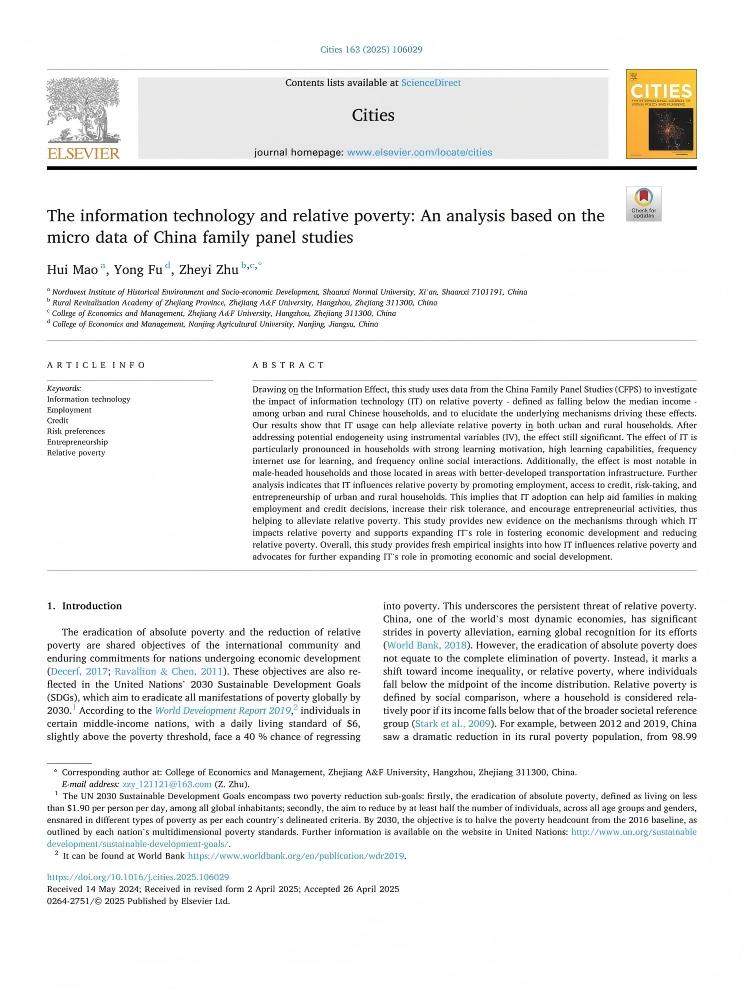 近日,由beat365官网朱哲毅副教授作为通讯作者的学术论文“The information technology and relative poverty: An analysis based on the micro data of China family panel studies”在经济学1区top期刊《Cities》上发表。该论文是朱哲毅副教授主持的教育部人文社科青年项目(21YJC790173)的阶段性成果。