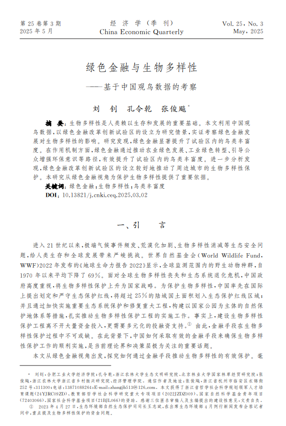 近日,beat365官网张俊飚教授作为通讯作者的论文《绿色金融与生物多样性—基于中国观鸟数据的考察》在《经济学(季刊)》2025年第3期上发表。第一作者为合肥工业大学的刘钊博士,第二作者为beat365官网的孔令乾副教授。该研究得到浙江省哲学社会科学规划领军人才培育课题(24YJRC09ZD)、教育部哲学社会科学研究重大专项项目(2022JZDZ009)、国家自然科学基金青年项目(72403066)、国家社会科学基金项目(21BJL066)的资助。