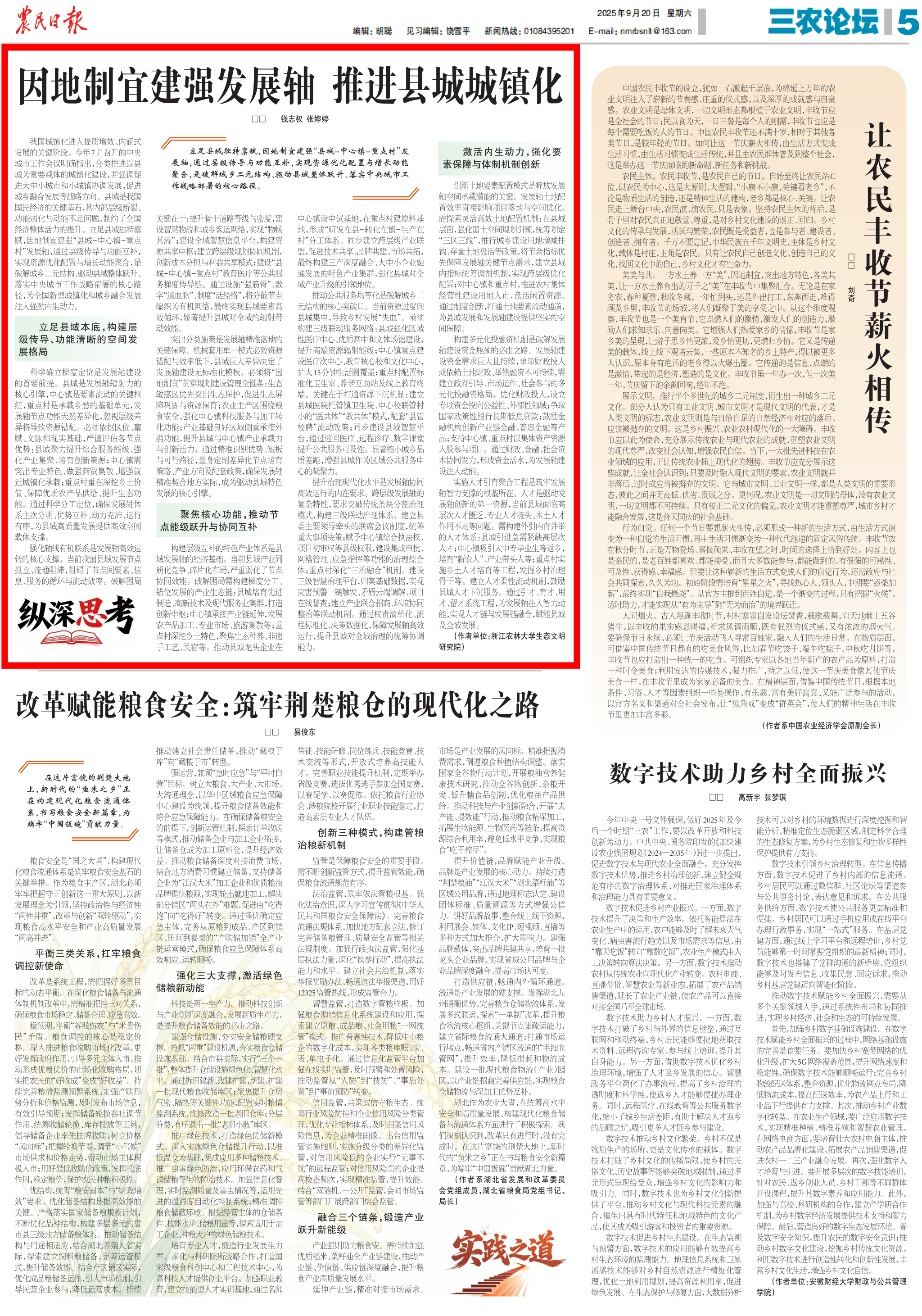 2025年9月20日,钱志权教授和张婷婷老师撰写的理论文章《因地制宜建强发展轴 推进县城城镇化》发表在《农民日报》三农论坛头条上。现将全文转载如下: