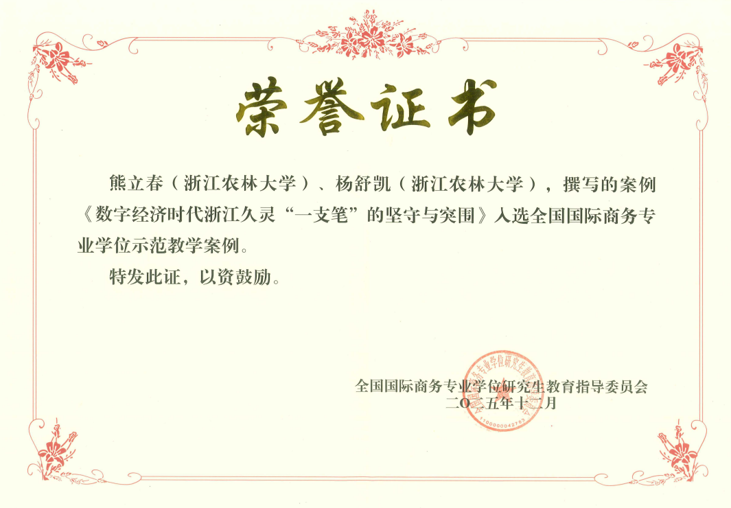 12月13日,全国国际商务专业学位研究生教育指导委员会示范教学案例总结会暨第三届国际商务教学案例开发与应用研讨会(2025)在北京第二外国语学院召开。大会公布了2025年国家级示范教学案例的入选名单,beat365官网熊立春副教授团队提交的案例《数字经济时代浙江久灵“一支笔”的坚守与突围》入选全国国际商务专业学位示范教学案例。该案例以浙江久灵笔刷有限公司为例,展现了浙江林产品典型企业在数字经济背景下的转型路径,该公司通过积极推动数字化转型、借助数字化分析工具与境内外电商及社交媒体平台开展营销,打造“线上+线下”一体化运营模式。通过跨境电商、社交平台推广与数据驱动市场分析,企业逐步从代工贴牌、薄利多销的传统模式,发展为拥有自主品牌、迈向全球价值链中高端的现代化企业。这一成功转型,为当前数字经济时代下的企业出海实践提供了有益借鉴。