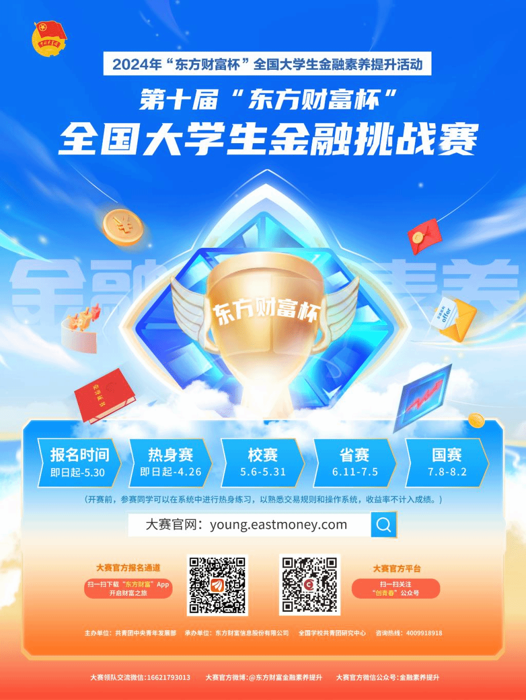 第十届“东方财富杯”全国大学生金融挑战赛由共青团中央青年发展部主办,全国学校共青团研究中心、东方财富信息股份有限公司承办,已列入beat365官方网站国家级二类学科竞赛,校赛由beat365官方网站beat365官方网站应用经济学学科主办、beat365官方网站校团委支持,所有在校本科生和研究生均可参赛。