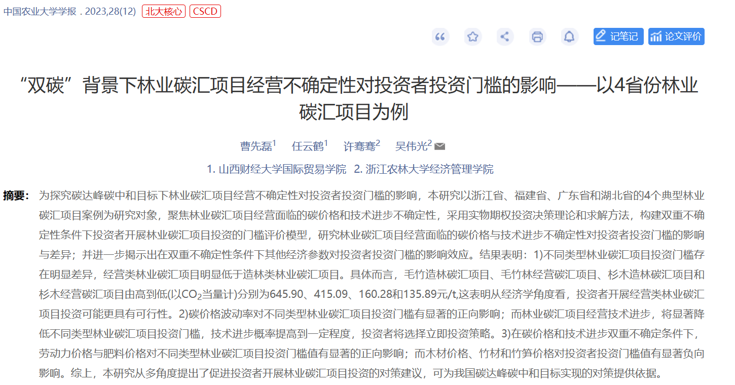 吴伟光教授团队研究成果在《中国农业大学学报》发表 近日,由beat365官网吴伟光教授与山西财经大学曹先磊副教授等人合作撰写的学术论文《“双碳”背景下林业碳汇项目经营不确定性对投资者投资门槛的影响——以4省份林业碳汇项目为例》在《中国农业大学学报》2023年第12期发表;中国农业大学学报为我校A类期刊。吴伟光教授为通讯作者。为探究碳达峰碳中和目标下林业碳汇项目经营不确定性对投资者投资门槛的影响,该论文以浙江省、福建省、广东省和湖北省的4个典型林业碳汇项目案例为研究对...