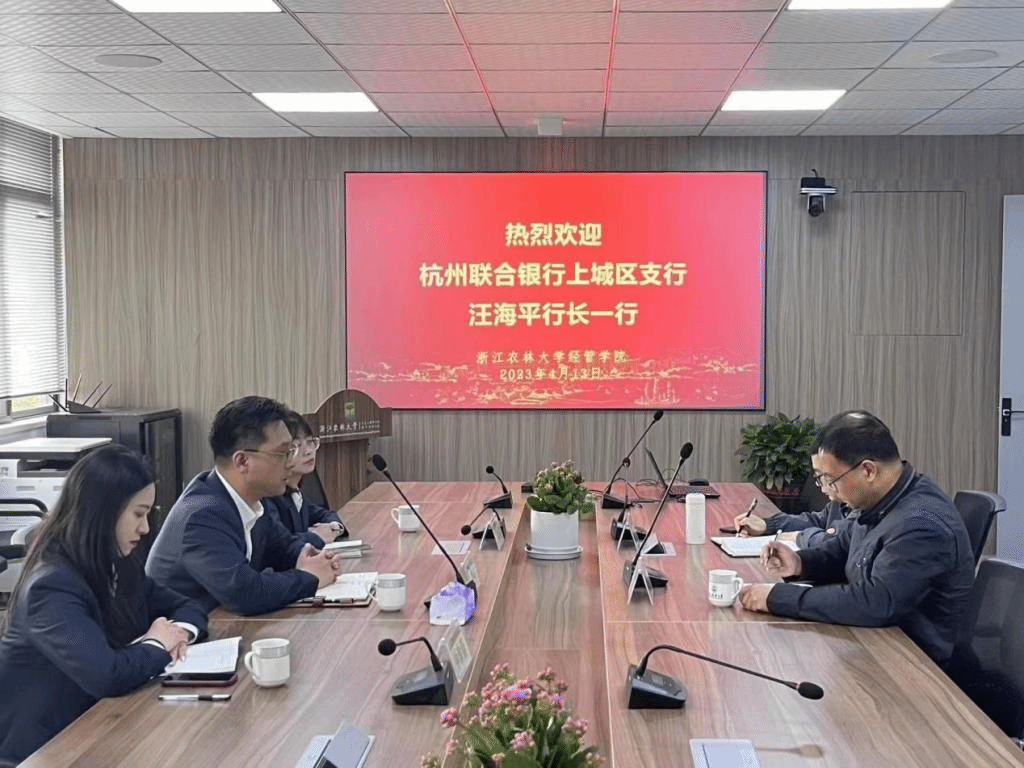 beat365官方网站与杭州联合银行上城区支行洽商合作 4月13日,杭州联合银行上城区支行汪海平行长一行赴beat365官方网站洽商银企合作。beat365官方网站党委书记周凯以及国际商务专硕学位点负责人、生态文明研究院办公室主任钱志权参与洽谈。 学院党委书记周凯对汪海平杭州一行的到来表示热烈的欢迎,并介绍了学校办学历史、学院学科专业发展现状。汪海平行长介绍了杭州联合银行历史沿革和主要业务情况。双方就建设本科实践教学基地、国际商务研究生工作站、党建联建、绿色金融研究与...